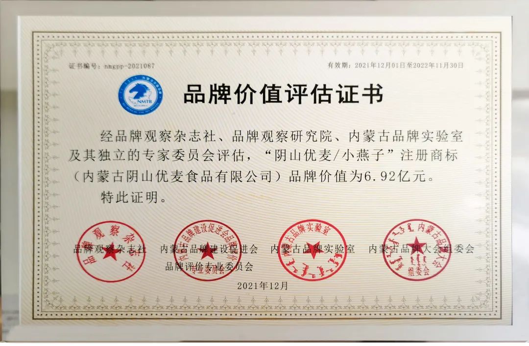 大會還發(fā)布了2021年度“內(nèi)蒙古百強(qiáng)品牌價值評估報告”,經(jīng)權(quán)威機(jī)構(gòu)及專家委員會評估,陰山優(yōu)麥品牌價值為6.92億元。